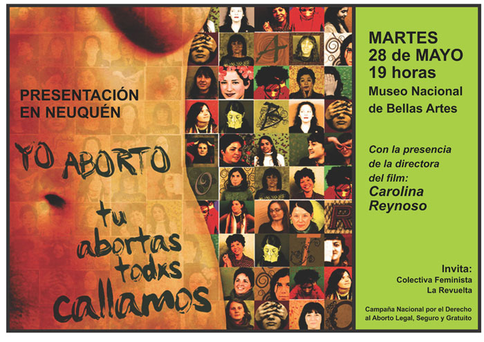 Se presentará en Neuquén el documental “Yo aborto, tú abortas, todxs callamos”, dirigido por Carolina Reynoso. La actividad se inscribe en acciones por el Día Internacional de Acción por la Salud de las Mujeres y contará con la presencia de su directora. En el documental siete mujeres, incluida la directora y una activista de la provincia de Neuquén, provenientes de distintas clases socioculturales reflexionan sobre una problemática que todas vivieron en sus cuerpos: el aborto clandestino. A través de sus testimonios se intenta derribar ciertos mitos en relación a la Interrupción Voluntaria del Embarazo, para así obtener una mirada renovada y desestigmatizante de la temática y continuar insistiendo con el derecho al aborto legal, seguro y gratuito.